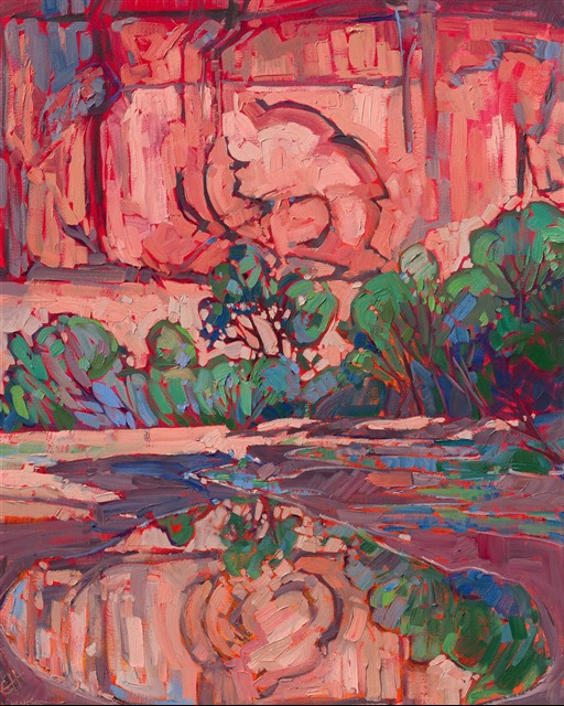 ERIN HANSON has been painting in oils since she was 8 years old. As a teenager, she apprenticed at a mural studio where she worked on 40-foot-long paintings while selling art commissions on the side. After being told it was too hard to make a living as an artist, she got her degree in Bioengineering from UC Berkeley. Afterward, Erin became a rock climber at Red Rock Canyon, Nevada. Inspired by the colorful scenery she was climbing, she decided to return to her love of painting and create one new painting every week.