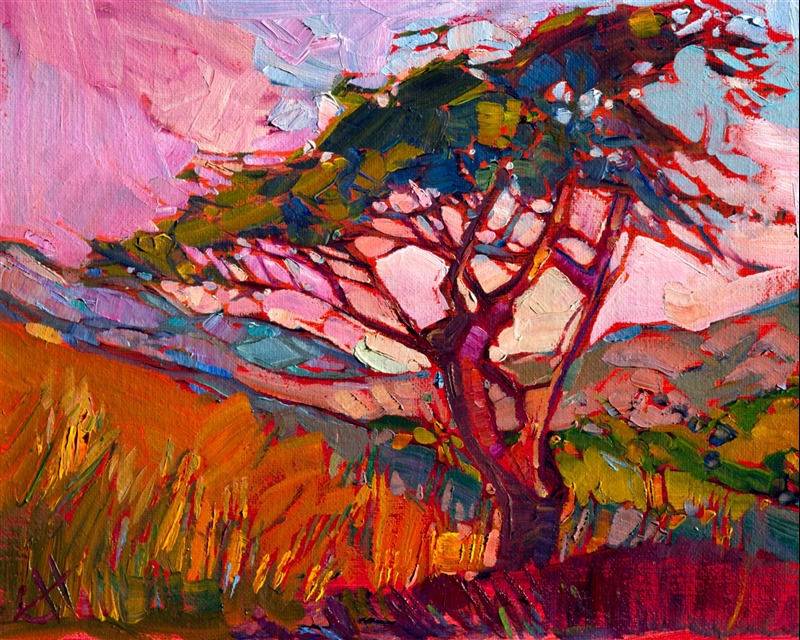 Style: "Open Impressionism" is a new style of painting developed by American artist Erin Hanson. The style is characterized by short, impasto brush strokes that are applied without layering, creating a mosaic or stained-glass appearance to the paintings. The paintings are created with a limited palette of colors, applied without blending or mixing upon the canvas, which adds a dimension of texture to each brush stroke. Inspired by classic impressionism, pointillism, and post-impressionism, Erin Hanson continues the tradition of impressionism into the modern day with her colorful and vivacious landscape paintings.