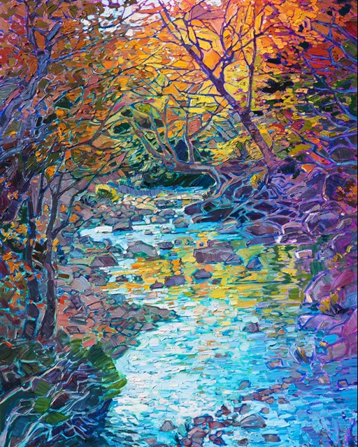 I came across this creek while leaf peeping in New England. The afternoon light illuminated the maple tree from behind and created a refraction of crystal light that was beautiful to behold. The brush strokes in the painting add a sense of movement to the piece.