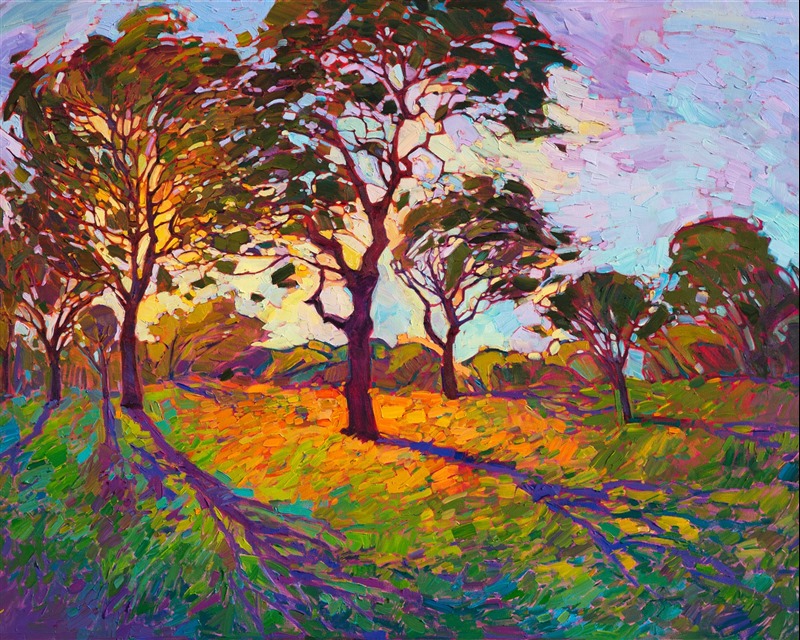 Style: "Open Impressionism" is a new style of painting developed by American artist Erin Hanson. The style is characterized by short, impasto brush strokes that are applied without layering, creating a mosaic or stained-glass appearance to the paintings. The paintings are created with a limited palette of colors, applied without blending or mixing upon the canvas, which adds a dimension of texture to each brush stroke. Inspired by classic impressionism, pointillism, and post-impressionism, Erin Hanson continues the tradition of impressionism into the modern day with her colorful and vivacious landscape paintings.