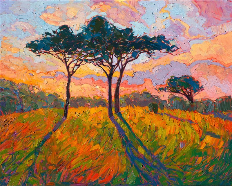 Style: "Open Impressionism" is a new style of painting developed by American artist Erin Hanson. The style is characterized by short, impasto brush strokes that are applied without layering, creating a mosaic or stained-glass appearance to the paintings. The paintings are created with a limited palette of colors, applied without blending or mixing upon the canvas, which adds a dimension of texture to each brush stroke. Inspired by classic impressionism, pointillism, and post-impressionism, Erin Hanson continues the tradition of impressionism into the modern day with her colorful and vivacious landscape paintings.