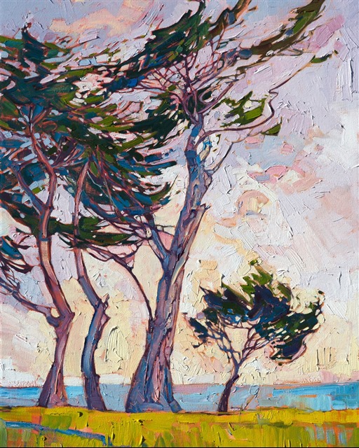 The majestic cypress trees of Monterey have inspired a whole series of paintings by Erin Hanson. Their beautiful bark and whimsical branches are a joy to paint. This painting captures the dancing cypress trees in Lover's Point, a park in Monterey.