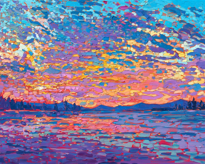 Note on varnishing: Erin’s paintings take six to eight weeks to dry, at which time we apply a retouching varnish, which allows the painting to complete the curing process while having a layer of protection against dirt and scuffs. The full curing process for an impasto oil painting takes at least two years. We are happy to assist in applying a final finishing varnish to your Erin Hanson oil painting once it has been dry for at least two years. Here is more information on how to care for your original oil painting.