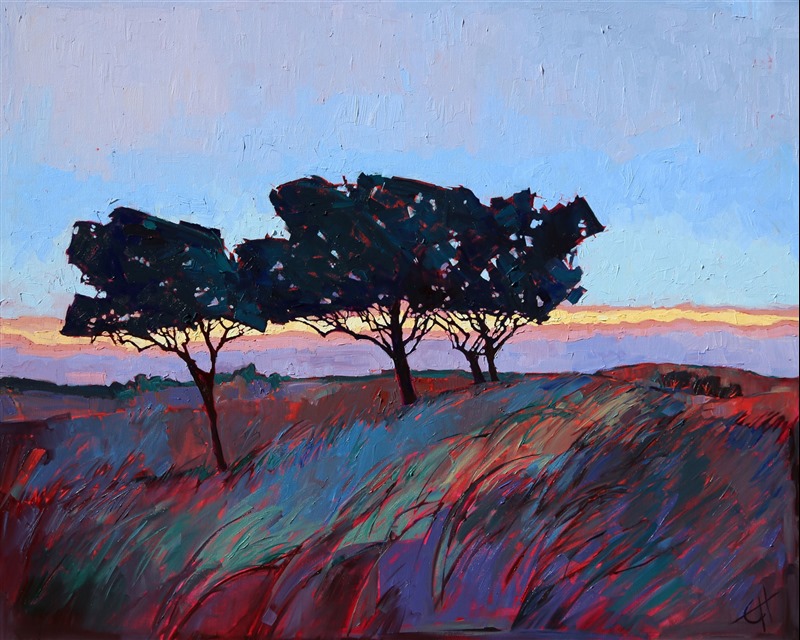 Three stark oaks stand out darkly against the final band of sunlight peeking through purple stripes of sunset clouds. The low rolling hills flatten out in the distance. The paint is laid on in thick, impressionistic brush strokes.