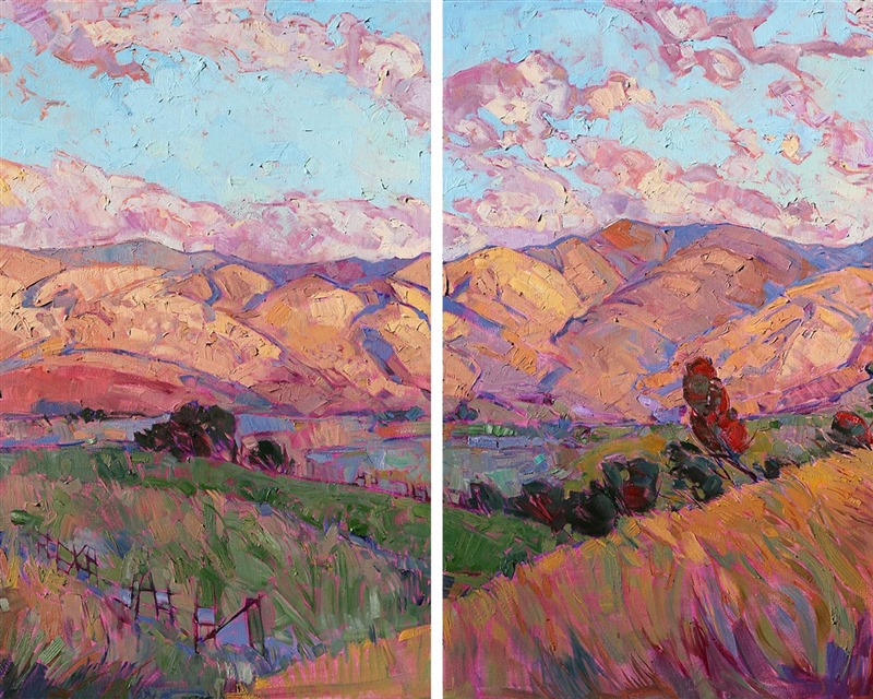 Beautiful morning light pours ever-changing color onto these rolling hills. The countryside is captured in a mosaic of color and texture that comes to life on the canvas.