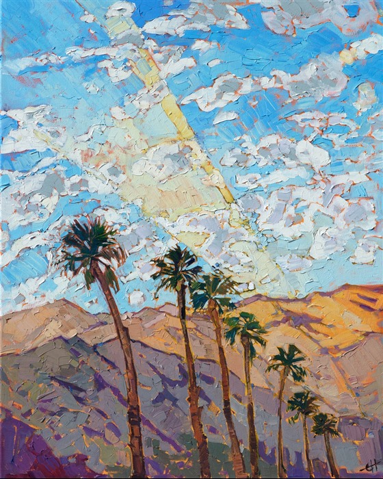 A line of palms sweeps along the base of the Santa Rosa Mountains, the windswept fronds reaching towards the desert sky. The brush strokes in the painting are loose and impressionistic, capturing all the life and movement of the outdoors.