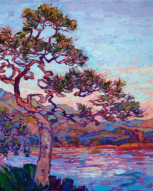Note on varnishing: Erin’s paintings take six to eight weeks to dry, at which time we apply a retouching varnish, which allows the painting to complete the curing process while having a layer of protection against dirt and scuffs. The full curing process for an impasto oil painting takes at least two years. We are happy to assist in applying a final finishing varnish to your Erin Hanson oil painting once it has been dry for at least two years. Here is more information on how to care for your original oil painting.