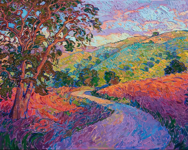 A winding road is illuminated with the warm rays of early dawn, bringing you into the landscape of central California's wine country. The brush strokes in this painting are loose and impressionistic, alive with color and life.