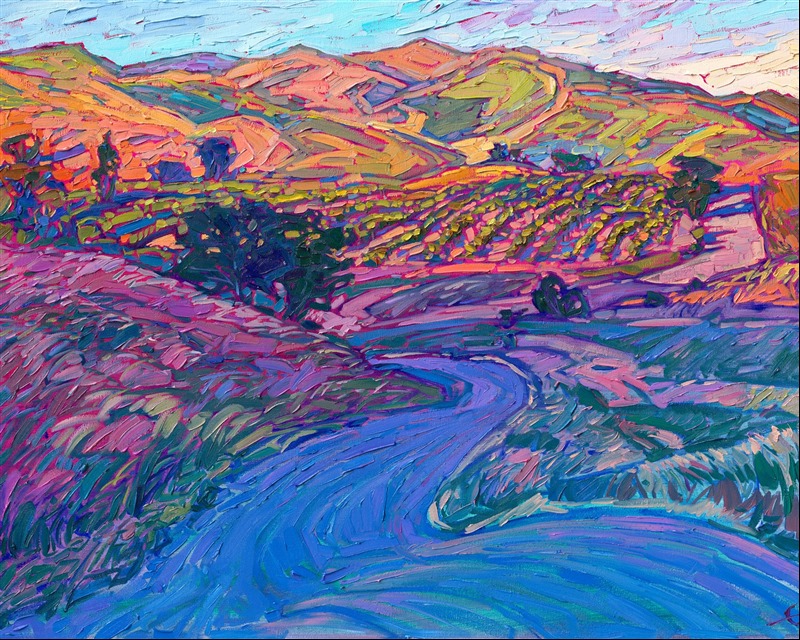 Style: "Open Impressionism" is a new style of painting developed by American artist Erin Hanson. The style is characterized by short, impasto brush strokes that are applied without layering, creating a mosaic or stained-glass appearance to the paintings. The paintings are created with a limited palette of colors, applied without blending or mixing upon the canvas, which adds a dimension of texture to each brush stroke. Inspired by classic impressionism, pointillism, and post-impressionism, Erin Hanson continues the tradition of impressionism into the modern day with her colorful and vivacious landscape paintings.