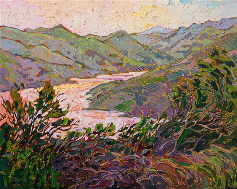 ERIN HANSON has been painting in oils since she was 8 years old. As a teenager, she apprenticed at a mural studio where she worked on 40-foot-long paintings while selling art commissions on the side. After being told it was too hard to make a living as an artist, she got her degree in Bioengineering from UC Berkeley. Afterward, Erin became a rock climber at Red Rock Canyon, Nevada. Inspired by the colorful scenery she was climbing, she decided to return to her love of painting and create one new painting every week.
