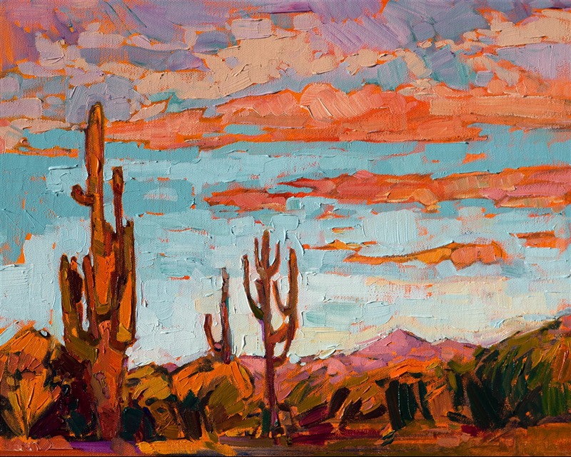 Note on varnishing: Erin’s paintings take six to eight weeks to dry, at which time we apply a retouching varnish, which allows the painting to complete the curing process while having a layer of protection against dirt and scuffs. The full curing process for an impasto oil painting takes at least two years. We are happy to assist in applying a final finishing varnish to your Erin Hanson oil painting once it has been dry for at least two years. Here is more information on how to care for your original oil painting.