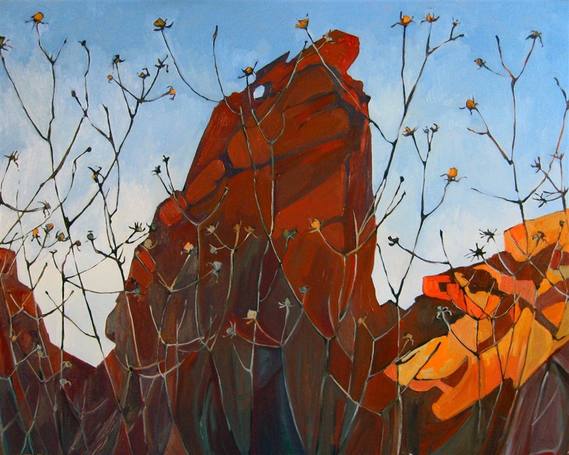 Original oil painting of Valley of Fire, north of Las Vegas. The desert wildflowers cut abstract shapes into the red sandstone boulder.
