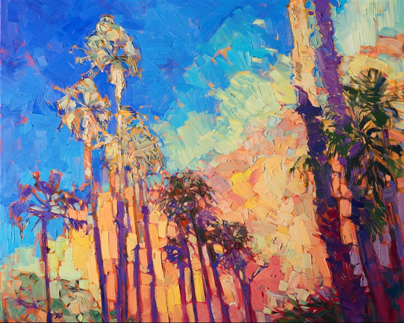 Note on varnishing: Erin’s paintings take six to eight weeks to dry, at which time we apply a retouching varnish, which allows the painting to complete the curing process while having a layer of protection against dirt and scuffs. The full curing process for an impasto oil painting takes at least two years. We are happy to assist in applying a final finishing varnish to your Erin Hanson oil painting once it has been dry for at least two years. Here is more information on how to care for your original oil painting.