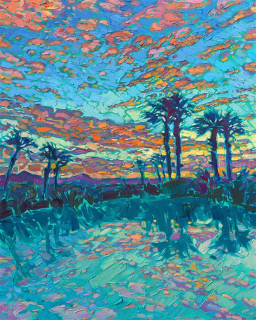Note on varnishing: Erin’s paintings take six to eight weeks to dry, at which time we apply a retouching varnish, which allows the painting to complete the curing process while having a layer of protection against dirt and scuffs. The full curing process for an impasto oil painting takes at least two years. We are happy to assist in applying a final finishing varnish to your Erin Hanson oil painting once it has been dry for at least two years. Here is more information on how to care for your original oil painting.