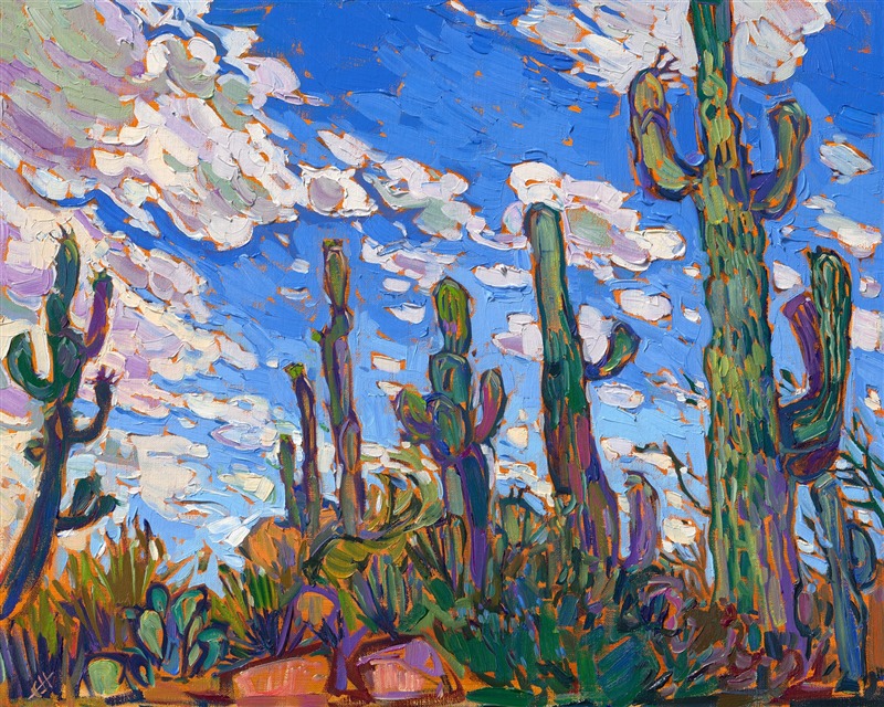 Ancient saguaro cacti grow everywhere you look in Saguaro National Park. I love painting these mighty plants, especially with an epic cloud backdrop.