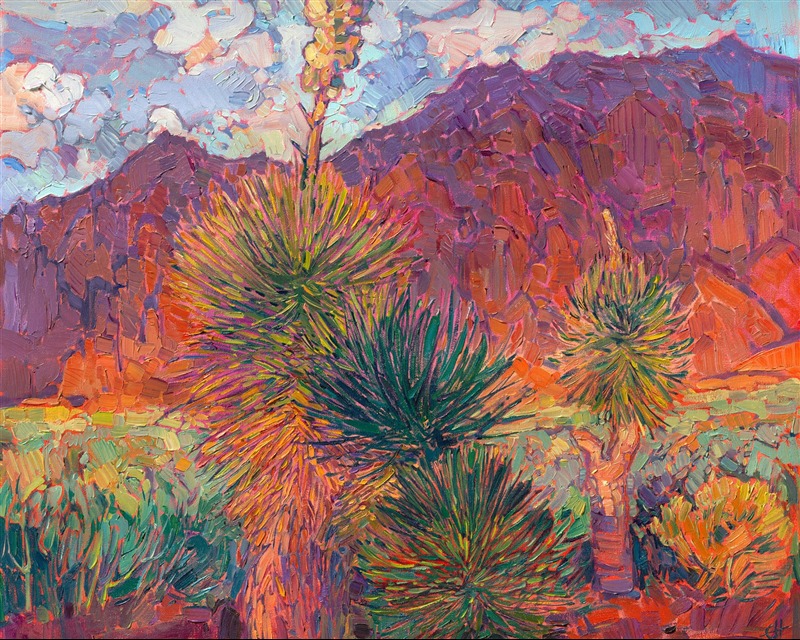 Note on varnishing: Erin’s paintings take six to eight weeks to dry, at which time we apply a retouching varnish, which allows the painting to complete the curing process while having a layer of protection against dirt and scuffs. The full curing process for an impasto oil painting takes at least two years. We are happy to assist in applying a final finishing varnish to your Erin Hanson oil painting once it has been dry for at least two years. Here is more information on how to care for your original oil painting.