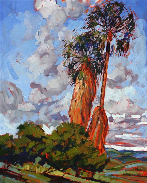 Loose, thickly applied oil painting strokes capture the wind blowing through these palm trees near San Diego, California.