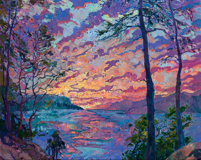 Note on varnishing: Erin’s paintings take six to eight weeks to dry, at which time we apply a retouching varnish, which allows the painting to complete the curing process while having a layer of protection against dirt and scuffs. The full curing process for an impasto oil painting takes at least two years. We are happy to assist in applying a final finishing varnish to your Erin Hanson oil painting once it has been dry for at least two years. Here is more information on how to care for your original oil painting.