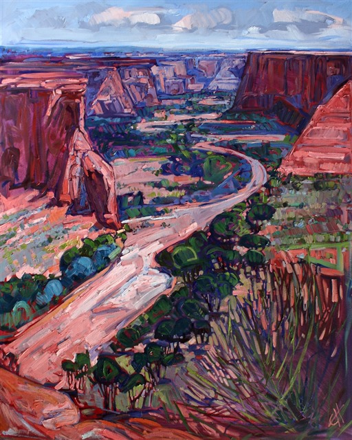 Awe-inspiring view of Canyon de Chelly, captured in bold brush strokes and brilliant color.