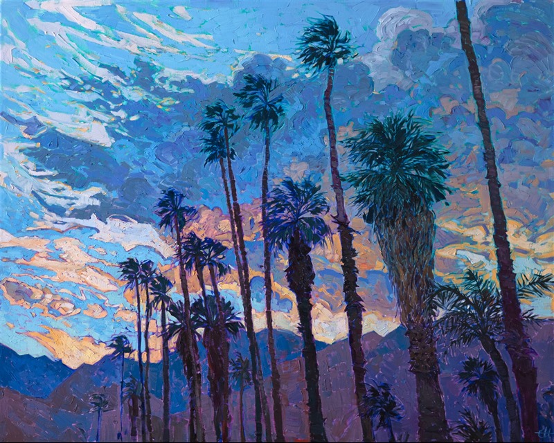 Note on varnishing: Erin’s paintings take six to eight weeks to dry, at which time we apply a retouching varnish, which allows the painting to complete the curing process while having a layer of protection against dirt and scuffs. The full curing process for an impasto oil painting takes at least two years. We are happy to assist in applying a final finishing varnish to your Erin Hanson oil painting once it has been dry for at least two years. Here is more information on how to care for your original oil painting.