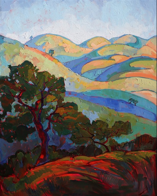 Style: "Open Impressionism" is a new style of painting developed by American artist Erin Hanson. The style is characterized by short, impasto brush strokes that are applied without layering, creating a mosaic or stained-glass appearance to the paintings. The paintings are created with a limited palette of colors, applied without blending or mixing upon the canvas, which adds a dimension of texture to each brush stroke. Inspired by classic impressionism, pointillism, and post-impressionism, Erin Hanson continues the tradition of impressionism into the modern day with her colorful and vivacious landscape paintings.