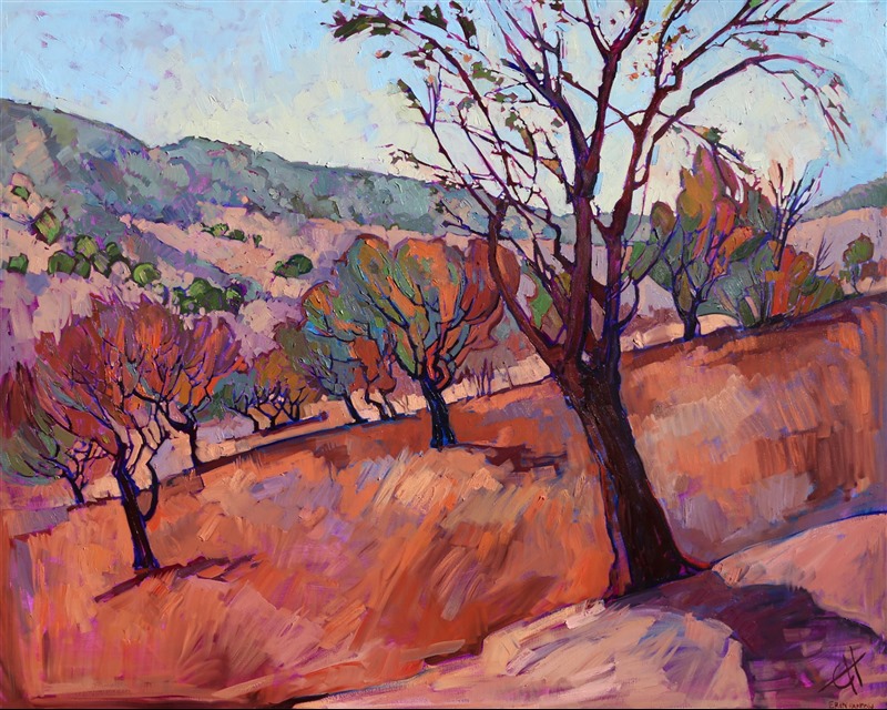 The walnut trees of Paso Robles are beautiful any time of year, but particularly when their leaves turn to a dusky gold, intermingled with jewel tones of amethyst and ultramarine - a beautiful contrast against the dark trunks and branches. This painting is big and bold, full of life and color, the paint applied with wide, thick strokes of oil.