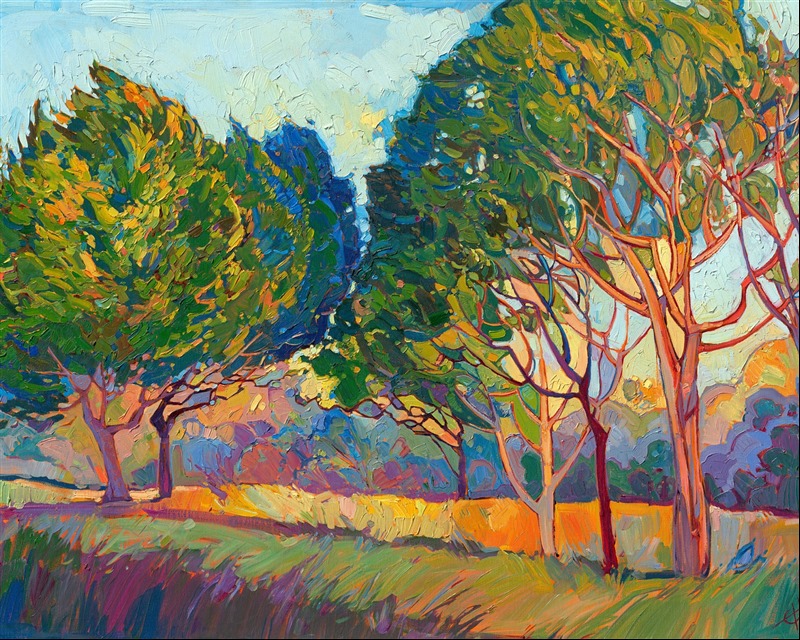 This abstract impressionist painting was inspired by the stately ficus trees growing in Pasadena, California. Their wide, outstretched branches interlace into a mosaic of color and light, as captured in lively impressionist oils by Erin Hanson.