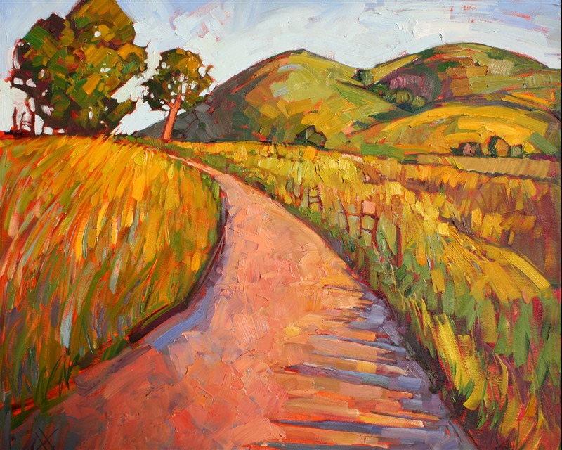 Bright gold summer grass from Paso Robles, captured in bold, lively paint stokes. This painting is done with both a brush and a palette knife (instead of with a brush only, which is Erin's preferred method of painting.) The thick application of oil paint gives this painting a very textural, sculptural effect.