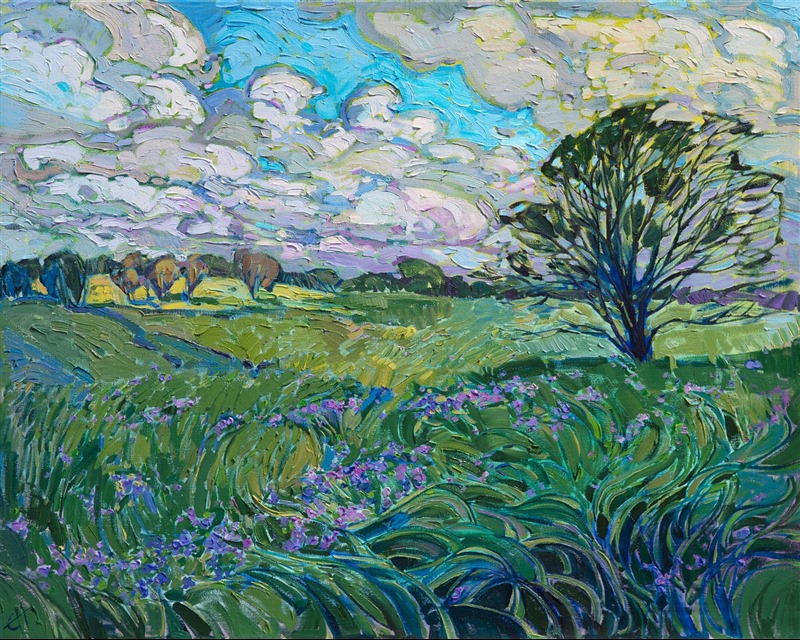 Long springtime grasses curl in the wind, a bath of green across the Texas landscape. Tiny blue wildflowers peek up among the grasses, waiting for the sunlight to shower down between the ever-moving clouds. The brush strokes in this painting are loose and impressionistic, capturing the life and changing color of the outdoors.