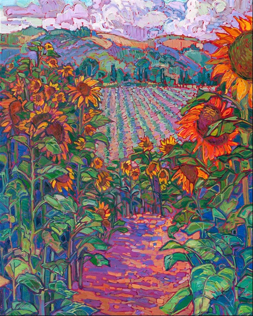 Note on varnishing: Erin’s paintings take six to eight weeks to dry, at which time we apply a retouching varnish, which allows the painting to complete the curing process while having a layer of protection against dirt and scuffs. The full curing process for an impasto oil painting takes at least two years. We are happy to assist in applying a final finishing varnish to your Erin Hanson oil painting once it has been dry for at least two years. Here is more information on how to care for your original oil painting.