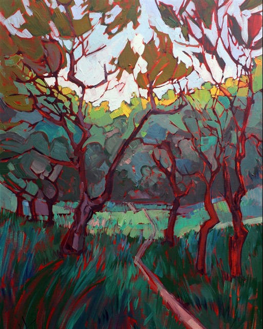 Style: "Open Impressionism" is a new style of painting developed by American artist Erin Hanson. The style is characterized by short, impasto brush strokes that are applied without layering, creating a mosaic or stained-glass appearance to the paintings. The paintings are created with a limited palette of colors, applied without blending or mixing upon the canvas, which adds a dimension of texture to each brush stroke. Inspired by classic impressionism, pointillism, and post-impressionism, Erin Hanson continues the tradition of impressionism into the modern day with her colorful and vivacious landscape paintings.
