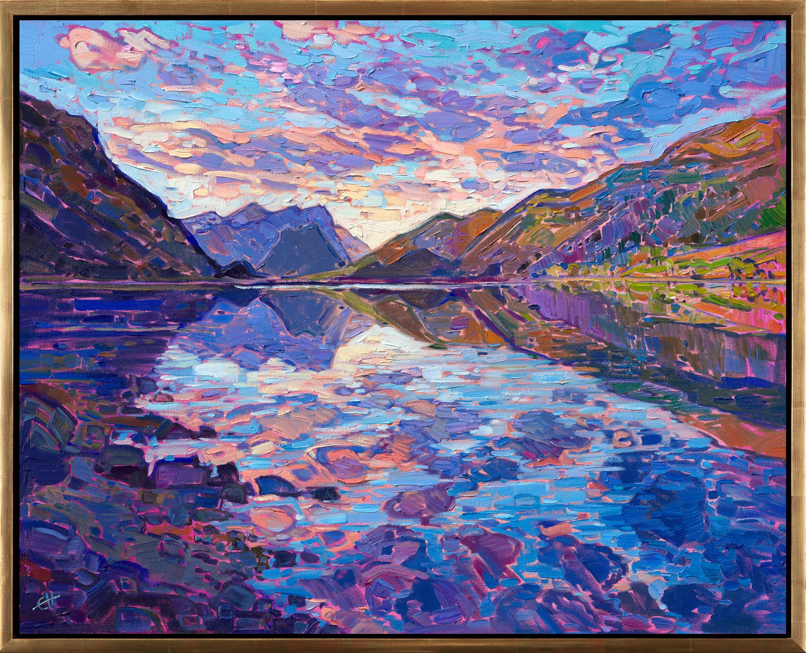 Framing: "Fjord Reflections" is an original oil painting created on 1-1/2" deep stretched canvas. The piece arrives framed in a custom floater frame finished in 23kt gold leaf.