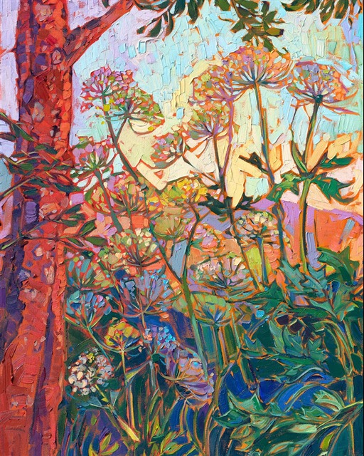 Note on varnishing: Erin’s paintings take six to eight weeks to dry, at which time we apply a retouching varnish, which allows the painting to complete the curing process while having a layer of protection against dirt and scuffs. The full curing process for an impasto oil painting takes at least two years. We are happy to assist in applying a final finishing varnish to your Erin Hanson oil painting once it has been dry for at least two years. Here is more information on how to care for your original oil painting.