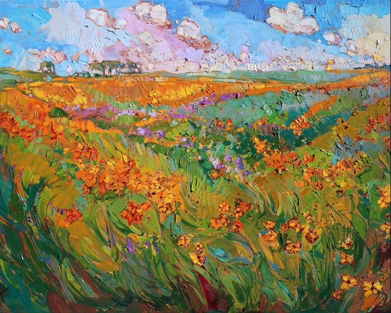Style: "Open Impressionism" is a new style of painting developed by American artist Erin Hanson. The style is characterized by short, impasto brush strokes that are applied without layering, creating a mosaic or stained-glass appearance to the paintings. The paintings are created with a limited palette of colors, applied without blending or mixing upon the canvas, which adds a dimension of texture to each brush stroke. Inspired by classic impressionism, pointillism, and post-impressionism, Erin Hanson continues the tradition of impressionism into the modern day with her colorful and vivacious landscape paintings.