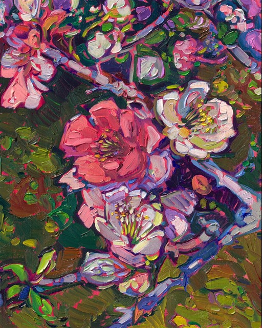 When I was photographing the cherry blossoms in Japan, I came across the most beautiful flowering quince I have ever seen. The bush was covered in flowers varying in color from pure white to blush to deep pink. This painting captures the beauty of these Japanese flowers with thick, expressive brush strokes of luscious oil paint.