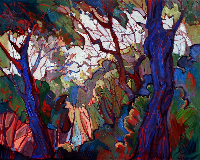 From deep in the oak trees of central California, the inspiration for this painting was born. The depth and texture is created with a mosaic technique of laying impasto brush strokes side-by-side, alla prima.