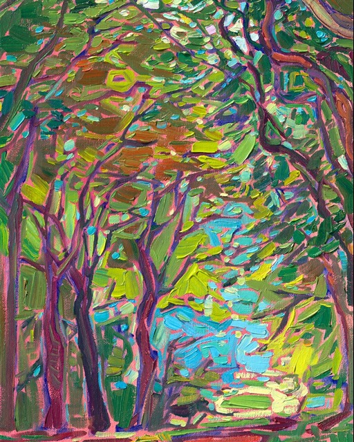 Style: "Open Impressionism" is a new style of painting developed by American artist Erin Hanson. The style is characterized by short, impasto brush strokes that are applied without layering, creating a mosaic or stained-glass appearance to the paintings. The paintings are created with a limited palette of colors, applied without blending or mixing upon the canvas, which adds a dimension of texture to each brush stroke. Inspired by classic impressionism, pointillism, and post-impressionism, Erin Hanson continues the tradition of impressionism into the modern day with her colorful and vivacious landscape paintings.