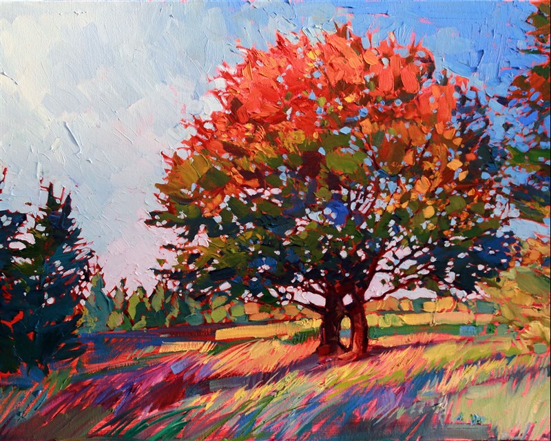 Style: "Open Impressionism" is a new style of painting developed by American artist Erin Hanson. The style is characterized by short, impasto brush strokes that are applied without layering, creating a mosaic or stained-glass appearance to the paintings. The paintings are created with a limited palette of colors, applied without blending or mixing upon the canvas, which adds a dimension of texture to each brush stroke. Inspired by classic impressionism, pointillism, and post-impressionism, Erin Hanson continues the tradition of impressionism into the modern day with her colorful and vivacious landscape paintings.