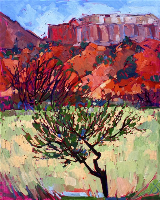 Style: "Open Impressionism" is a new style of painting developed by American artist Erin Hanson. The style is characterized by short, impasto brush strokes that are applied without layering, creating a mosaic or stained-glass appearance to the paintings. The paintings are created with a limited palette of colors, applied without blending or mixing upon the canvas, which adds a dimension of texture to each brush stroke. Inspired by classic impressionism, pointillism, and post-impressionism, Erin Hanson continues the tradition of impressionism into the modern day with her colorful and vivacious landscape paintings.