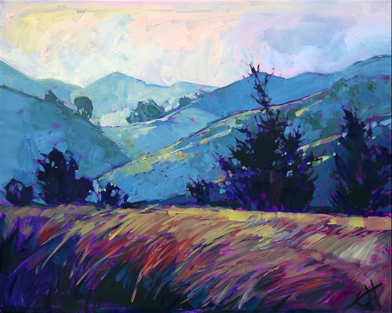 Style: "Open Impressionism" is a new style of painting developed by American artist Erin Hanson. The style is characterized by short, impasto brush strokes that are applied without layering, creating a mosaic or stained-glass appearance to the paintings. The paintings are created with a limited palette of colors, applied without blending or mixing upon the canvas, which adds a dimension of texture to each brush stroke. Inspired by classic impressionism, pointillism, and post-impressionism, Erin Hanson continues the tradition of impressionism into the modern day with her colorful and vivacious landscape paintings.