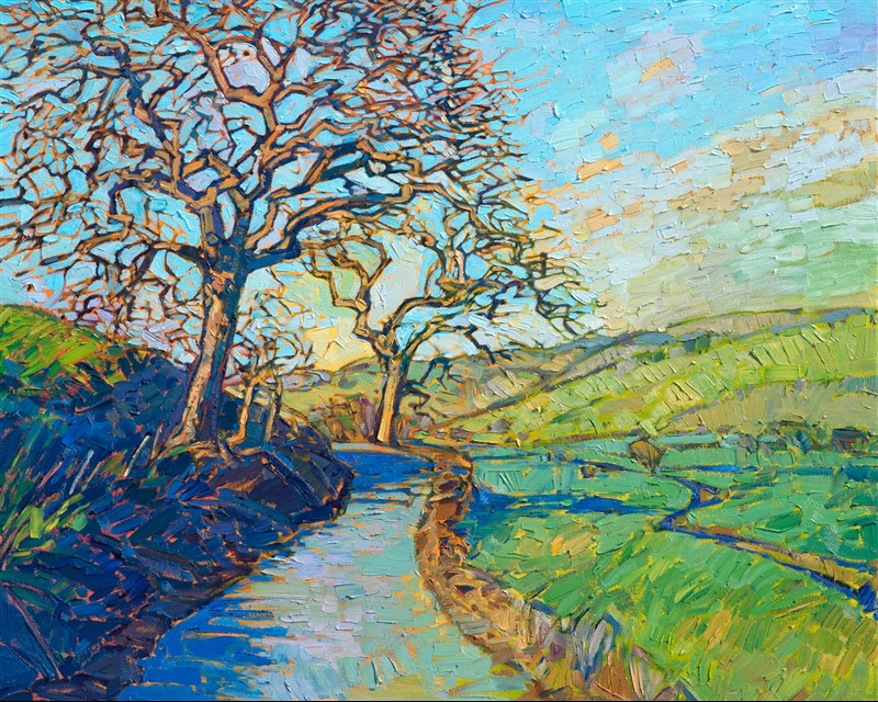 This winding road leads you through the grassy hillsides of Paso Robles, California wine country. In the early spring the hills are covered in crispy frost early in the morning, and then as dawn thaws the ground, the landscape turns from silver-gray to apple green. This painting captures such a morning with loose, expressive brush strokes.