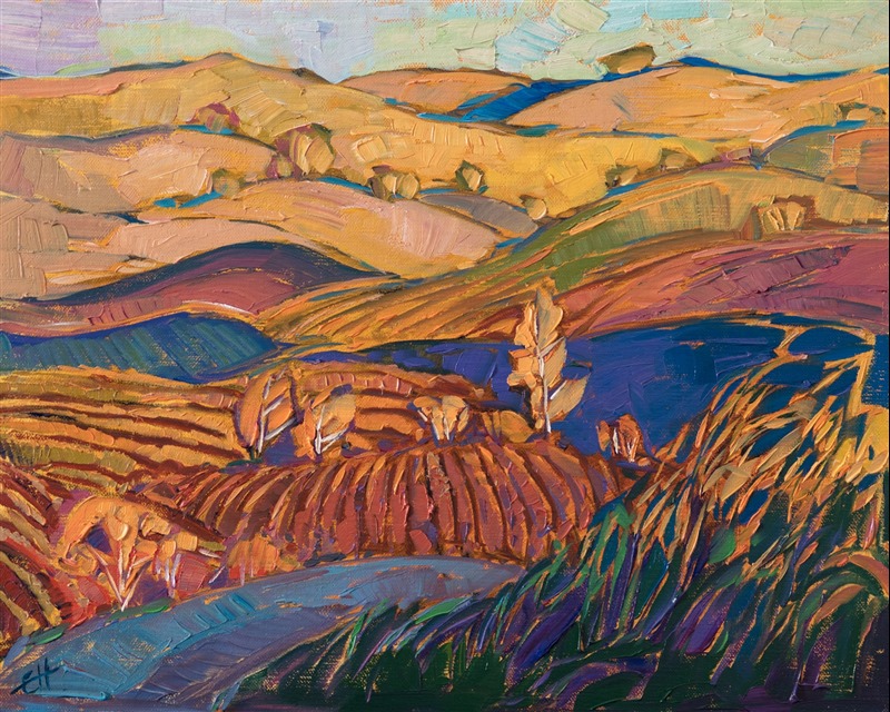 The gracefully curving hills of Paso Robles are captured here in warm hues of autumn, the cultivated fields resting during the winter months. The brush strokes are thick and impressionistic, creating a mosaic of color and texture across the canvas.