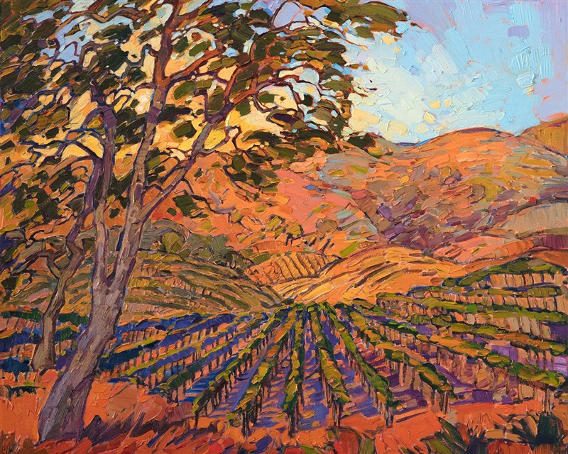 Note on varnishing: Erin’s paintings take six to eight weeks to dry, at which time we apply a retouching varnish, which allows the painting to complete the curing process while having a layer of protection against dirt and scuffs. The full curing process for an impasto oil painting takes at least two years. We are happy to assist in applying a final finishing varnish to your Erin Hanson oil painting once it has been dry for at least two years. Here is more information on how to care for your original oil painting.
