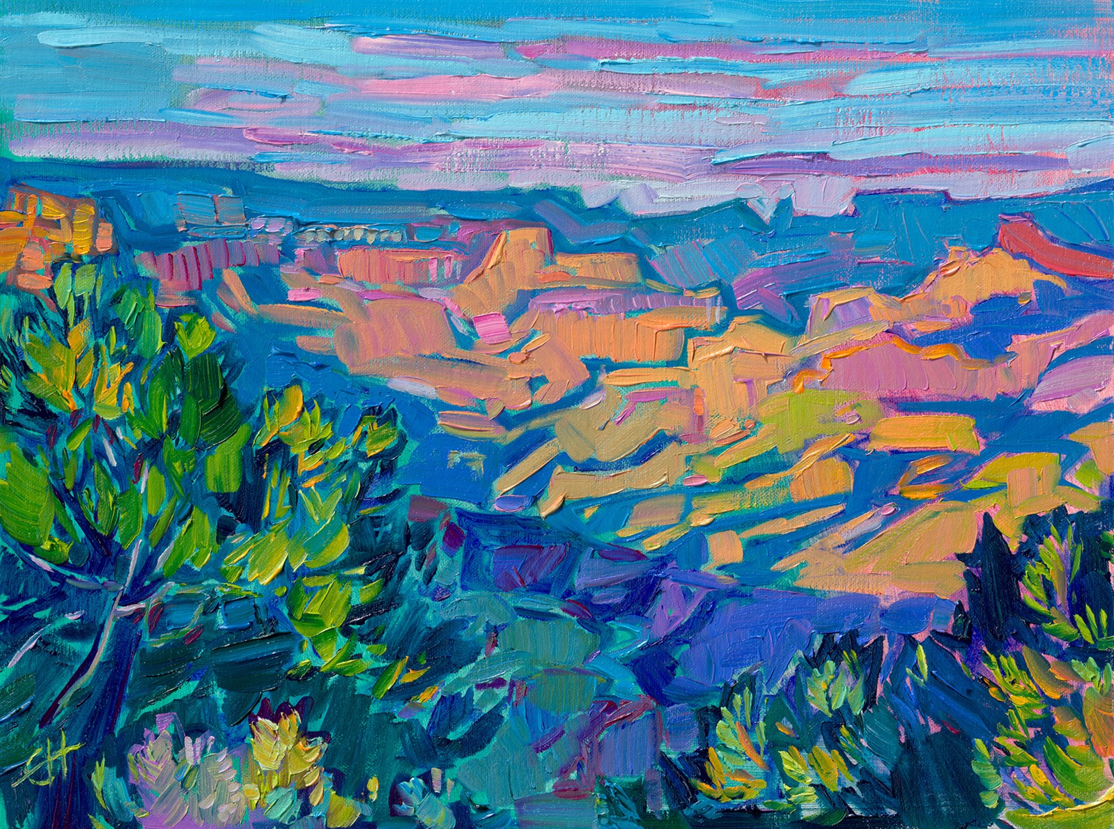 This petite painting of the Grand Canyon captures the majesty of the canyon at dawn. Rich hues of gold and umber contrast with royal blue and verdant green. Each brush stroke is placed side-by-side without overlapping, in Erin's iconic Open Impressionism style.