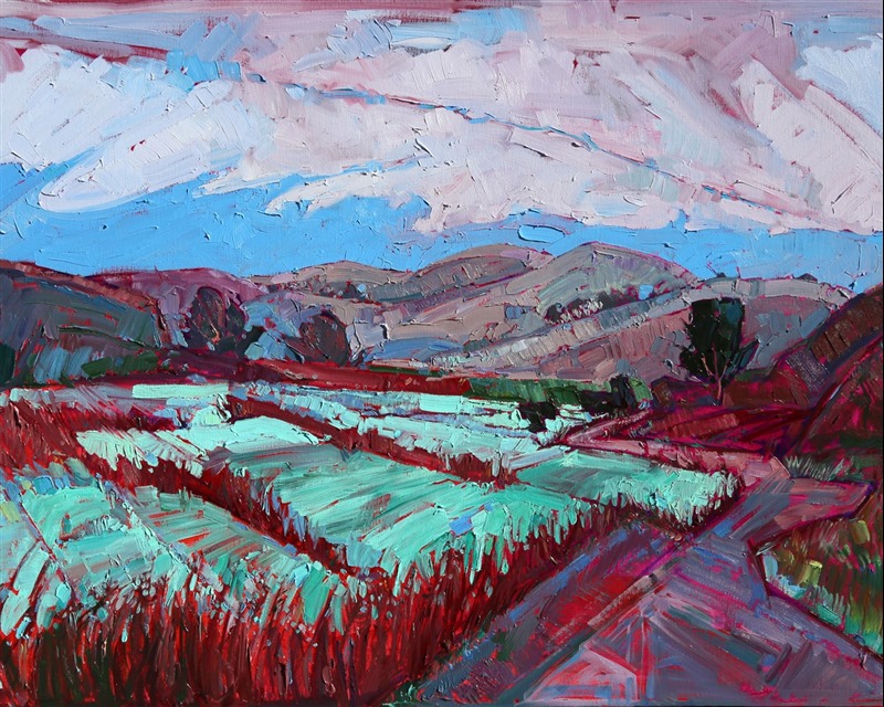 Thick brush strokes capture the movement and feel of Paso Robles, California. The fields have a frosty, sea-green color in the first morning light.