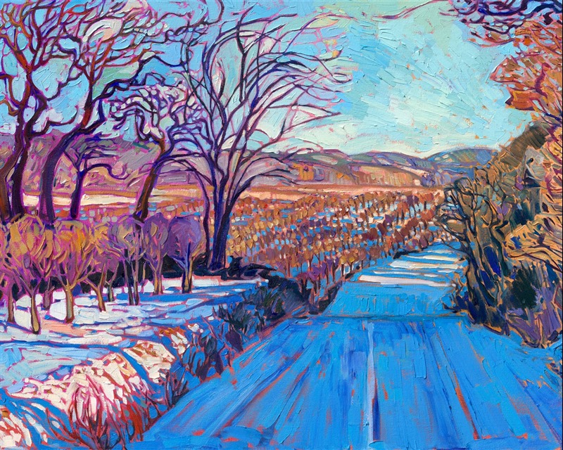 Note on varnishing: Erin’s paintings take six to eight weeks to dry, at which time we apply a retouching varnish, which allows the painting to complete the curing process while having a layer of protection against dirt and scuffs. The full curing process for an impasto oil painting takes at least two years. We are happy to assist in applying a final finishing varnish to your Erin Hanson oil painting once it has been dry for at least two years. Here is more information on how to care for your original oil painting.