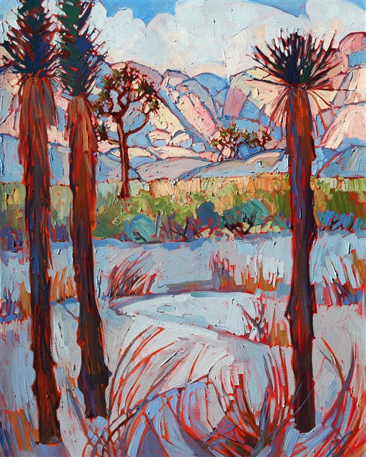 Style: "Open Impressionism" is a new style of painting developed by American artist Erin Hanson. The style is characterized by short, impasto brush strokes that are applied without layering, creating a mosaic or stained-glass appearance to the paintings. The paintings are created with a limited palette of colors, applied without blending or mixing upon the canvas, which adds a dimension of texture to each brush stroke. Inspired by classic impressionism, pointillism, and post-impressionism, Erin Hanson continues the tradition of impressionism into the modern day with her colorful and vivacious landscape paintings.