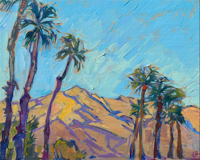 The delicate hues of dawn illuminate the dusty desert mountains of Palm Springs and turn them into an impressionist's paradise. Thick brush strokes of oil paint capture the movement and color of the desert at dawn.