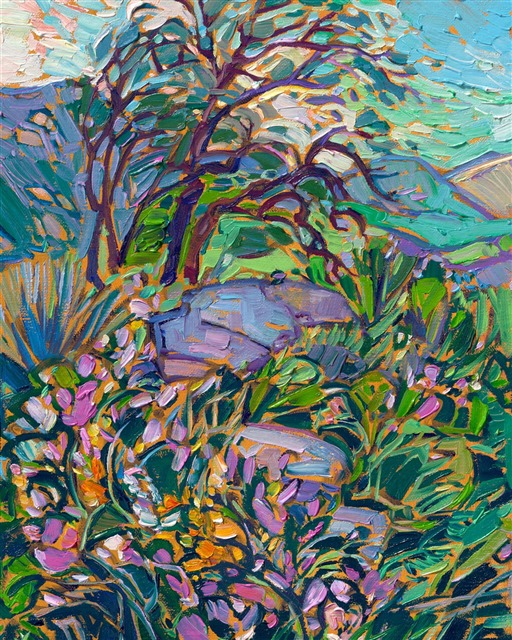 Style: "Open Impressionism" is a new style of painting developed by American artist Erin Hanson. The style is characterized by short, impasto brush strokes that are applied without layering, creating a mosaic or stained-glass appearance to the paintings. The paintings are created with a limited palette of colors, applied without blending or mixing upon the canvas, which adds a dimension of texture to each brush stroke. Inspired by classic impressionism, pointillism, and post-impressionism, Erin Hanson continues the tradition of impressionism into the modern day with her colorful and vivacious landscape paintings.