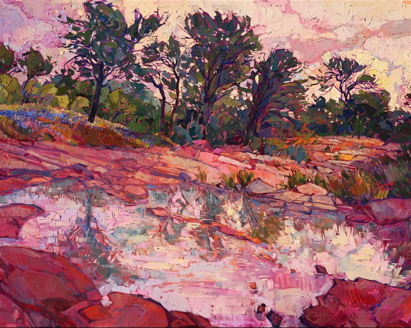The hill country north of Fredericksburg, Texas, is abloom with bluebonnets in spring, while the low watering pools capture oaken reflections in their surfaces. The warm hues of early morning bathe the landscape in delicate pinks and orange sherbet. This restful painting is yet alive with motion through the thickly applied brushstrokes, which seem to form a mosaic of color and texture across the canvas.